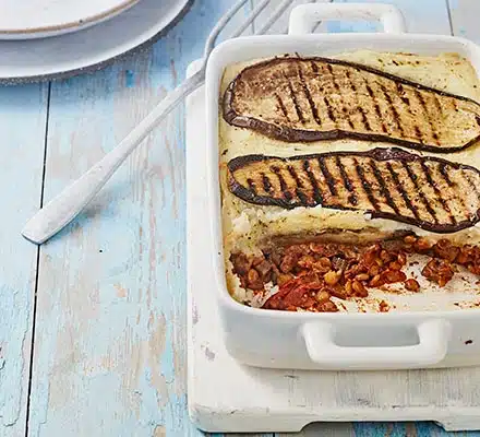 30g hongos porcini secos 8 cdas aceite de oliva 1 cebolla, finamente picada 2 zanahorias, finamente picadas 2 tallos de apio, finamente picados 4 dientes de ajo, en láminas Tomillo fresco 1 cdita extracto de tomate 100ml vino tinto (opcional) 250g lentejas verdes secas 800 g tomates perita enteros (pueden ser en lata) 250g champiñones 250g hongos portobello, en láminas 1 cdita salsa de soja 1 cdita levadura nutricional 1 kg papas, peladas y cortadas 1½ cditas orégano 3 berenjenas, cortadas a lo largo 150ml leche de soja Sal marina Cubrir los hongos porcini secos con 800 ml de agua hirviendo y dejar hidratar durante 10 minutos. Mientras tanto, calentar 1½ cucharada de aceite de oliva en una olla grande. Agregar la cebolla, la zanahoria, el apio y una pizca de sal. Cocinar a fuego bajo, revolviendo, durante 10 minutos hasta que estén tiernos. Retirar los porcini del líquido, reservar el caldo de remojo y picar groseramente los hongos. Incorporar el ajo y el tomillo a la olla y cocinar durante un minuto. Añadir el extracto de tomate y cocinar un minuto más. Verter el vino tinto (opcional) y dejar reducir casi por completo. Agregar las lentejas, el caldo reservado de los hongos y los tomates. Llevar a hervor, bajar el fuego y cocinar a fuego suave con la olla tapada. Calentar una sartén amplia y añadir 1½ cucharada de aceite de oliva. Incorporar todos los hongos, incluidos los porcini hidratados. Cocinar hasta que se evapore el líquido y los hongos estén bien dorados. Agregar la salsa de soja, mezclar y volcar todo en la olla del ragú. Incorporar la levadura nutricional y continuar la cocción del ragú a fuego medio-bajo durante 30 a 45 minutos, revolviendo ocasionalmente, hasta que las lentejas estén tiernas y la salsa espesa. Agregar un poco de agua si fuera necesario. Retirar las ramas de tomillo y ajustar la sazón. Precalentar el horno a 180°C. Colocar las papas en una olla con agua fría con sal, llevar a hervor y cocinar hasta que estén bien tiernas. Mezclar las 5 cucharadas restantes de aceite de oliva con el orégano. Pincelar las berenjenas con la mayor parte de esta mezcla y espolvorear con sal marina. Cocinar en plancha o sartén acanalada durante 3 minutos por lado, hasta que estén tiernas. Escurrir las papas y hacer un puré incorporando la leche de soja. Ajustar la sal. Distribuir el ragú en una fuente grande para horno (o dos medianas). Colocar una capa con la mitad de las berenjenas, cubrir con el puré de papas y pincelar con el aceite de orégano restante. Finalizar con el resto de las berenjenas. Hornear durante 25 a 35 minutos, hasta que esté dorado y burbujeante.